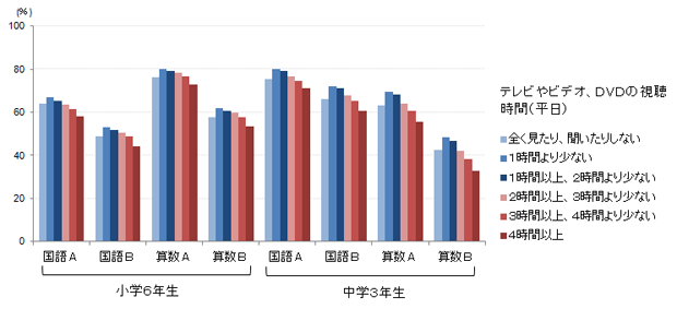 図2 全国学力・学習状況調査の平均正答率(テレビなどの視聴時間別)