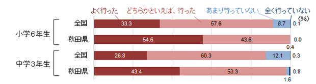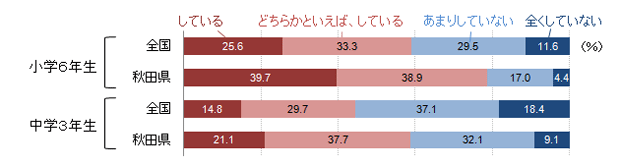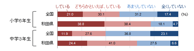 図3は、家庭学習時間を表したものだ。これを見ると、秋田県は「1時間以上」という中間層が多く、学習時間が短い子どもや長い子どもが少ないことがわかる。通塾率が低く、長時間の勉強をしているわけではないが、家庭学習をきちんとしている子どもが多いためだろう。また、図4からは「自分で計画を立てた家庭学習」を「している」比率が全国平均に比べて高いこと、図5からは「テストで間違えた問題の勉強」を「している」比率が全国平均に比べて高いことがわかる。相対的に多くの子どもたちが、効果的な学習方法を身につけていると推察できる結果である。このことを裏づけるように、学校質問紙で「家庭での学習方法等を具体例を挙げながら教えたか」をたずねた結果(図6)では、「よく行った」の比率がやはり高い。このような学校現場での学習方法への配慮が、学力向上につながっていると考えられないだろうか。