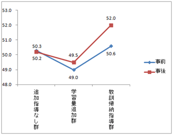 そこで我々は認知心理学のいくつかの学習方略の中から、間違いなどの過去の経験を次の学習にいかせるようにコメントを残しておく「教訓帰納」と呼ばれる学習方略に着目し、子どもが自発的にこの方略を利用できるように促す家庭学習教材を開発した。そして先述した701名の中から、テストの得点で統制した子ども150名を抽出し、さらに通常の指導に加えて特に付加的な指導を行わなかった群(追加指導なし群)、追加でドリル形式の教材に取り組んでもらった群(学習量追加群)、教訓帰納の利用を促す教材に取り組んでもらった群(教訓帰納指導群)の3つの比較群(各50名)に分けて、指導効果の検証を行った。教材を用いた指導期間は2カ月間で、1カ月毎に教材を発送、回収した。そして指導前後のテストの得点(偏差値換算)の伸びを比較した。なお、学習量追加群と教訓帰納指導群の指導効果を比較するために、ドリル形式の教材と教訓帰納の利用を促す教材は同じ分量に調整している。