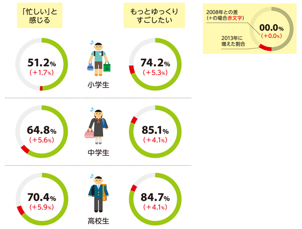 本調査で心や身体の疲れについてたずねたところ、「忙しい」と感じている子どもは、小学生51.2%、中学生64.8%、高校生70.4%で、どの学校段階でも半数を超えている。また、「もっとゆっくりすごしたい」と感じている子どもは小学生74.2%、中学生85.1%、高校生84.7%と高い。しかも「忙しい」「もっとゆっくりすごしたい」のどちらも、5年前に実施した第1回調査(2008年実施)と比べてその割合は高くなっている(図1)。