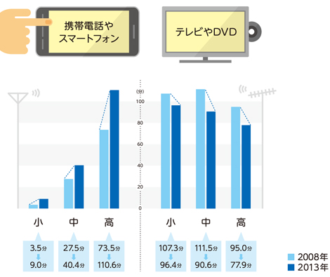 一方で、ふだん(学校がある日)のテレビやDVDの視聴時間についてたずねたところ、平均時間は小学生で-11分、中学生で-21分、高校生で-17分と第1回調査と比べて減少している。子どもたちの興味・関心が、テレビの世界から他へ移行している可能性もある。しかし、子どもたちは携帯電話・スマートフォンの使用時間を増やす一方で、テレビやDVDの視聴時間を抑えることで、限られた放課後の時間をやりくりしようと工夫しているようにもみえる(図2)。