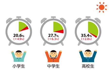 子どもたちの生活リズムの基本である睡眠時間についてみてみると、どの学校段階でも第1回調査の結果と大きくは変わっていない(図3)。しかし起床時刻をみると、朝6時までに起きる子どもたちの割合が増えている(図4)。ここではデータは示さないが、就寝時刻も早まる傾向にあり、生活リズムは維持・改善されているようだ。これは文部科学省が推進する「早寝早起き朝ごはん」国民運動の成果の表れとも言えるかもしれない。