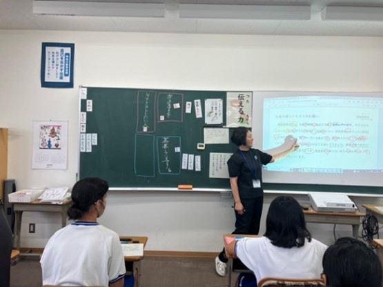 この日、日本語2の教室では、教室を半分に区切って、日本語2と数学の授業が行われていました。日本語2の授業では、読解のプリントで主語と述語の関係に取り組んでおり、10名ほどの生徒を、先生と母語支援員の方の2名で指導・支援を行っていました。1年生の国語の授業では、教科書の物語文の登場人物と流れを先生と一緒に確認しているところでした。2年生の国語では、先生や国際教室の他の生徒がつくった短歌にふれたあと、自分でも短歌を作ってみていました。スピーチに取り組む3年生の授業では、前の授業で録画した自分の練習の様子を確認、よいスピーチはどんなものか考えた後、修正点を定めてあらためてスピーチの練習を行っていました。どの学年も先生の支援のもとで、クラスメートとやりとりをしながら、活動に取り組んでいました。