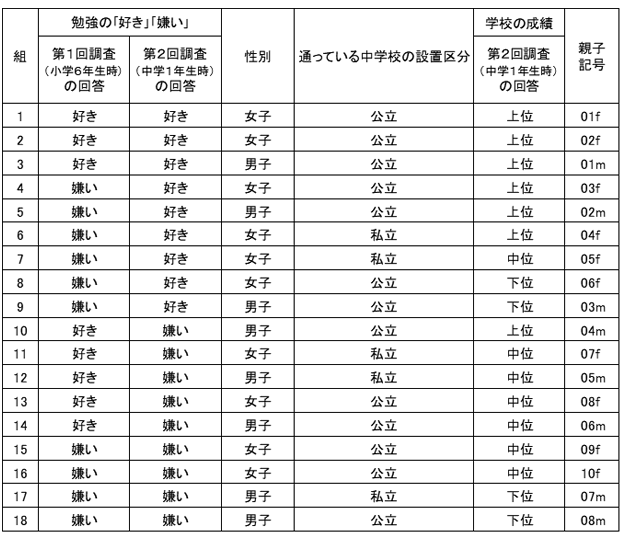 ※勉強の「好き」「嫌い」の回答(第1回調査・第2回調査)、子どもの性別、学校の成績(第2回調査)、母親の学歴、居住地域の条件が異なる246組の親子に調査を依頼し、協力の承諾の得られた18組の親子に実施。