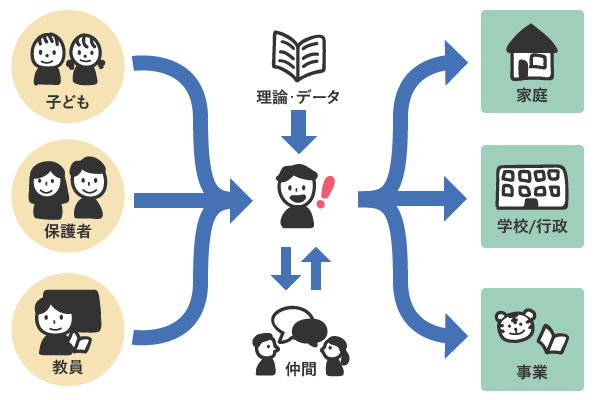 木村 ベネッセ教育総合研究所副所長の木村です。私は、「子どもの育ち」と「その育ちの周りにある環境との相互作用」に興味・関心を持っています。下の図にあるように、当研究所は子ども・保護者・教員の考えを理解・解釈し、それを形にして家庭・学校/行政・事業に伝える、「翻訳者」のような役割だと認識しており、インタビュー等を含めた社会調査を行っています。