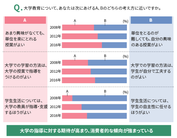 これは、8年間での学生の意識変化を調査したものですが、単位取得、大学での学習方法、学生生活のすべてにおいて、より楽に過ごせる環境を望む学生が増えていく傾向が見てとれます。加治さんがおっしゃったように、志高く活動する層と、より楽な方に流れる層のギャップは広がっているのかもしれません。