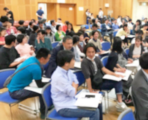 下の写真は、昨年春の軽井沢風越学園の「学校づくり途中経過報告会」の様子です。地域の人たちを含めて教育に関心のある人たちが全国から集まり、これからの教育について協働するワークショップも行われました。