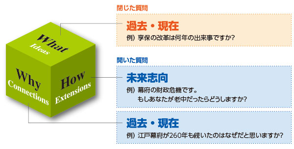ICEモデル自体は枠組みにすぎないので、それを授業で活用するためには枠の「中身」が必要となります。その枠の中身にあたるのが「問い」です。 Ideas、Connections、Extensionsの各フェーズで、生徒の主体性を損なわないように注意しながら問いを立てます 。