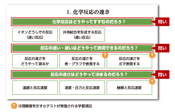 今取り組んでいることのひとつが、「グラフィックシラバス」です。従来のシラバスは作ること自体が目的化してしまっており、せっかく作成しても結局誰も見ないということがよくあります。生徒たちが興味を持って利活用してくれるシラバスを作るにはどうしたらよいか。そうした視点から取り入れるようになったのが、学習項目を図式化するグラフィックシラバスです。 生徒たちの心を動かせるように、「問い」も入れる ようにしています。 そもそも教科書に載っている内容は、かつて先達が不思議だなと感じたこと なんです。であれば、子どもたちも同じ「問い」に惹かれるかもしれない。そのことに気づいてから、ただ単にシラバスを図式化するだけでなく、問いを投げかけるかたちで作成するようになりました。