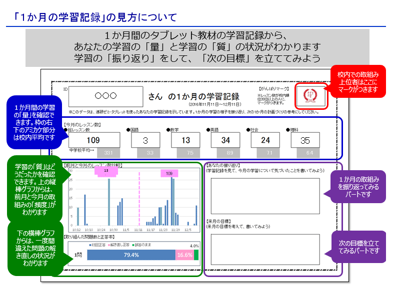 タブレット教材から得られる生徒一人ひとりの学習記録。これを上手に生かして生徒のやる気や学力を高められないだろうか。そのような思いから、生徒一人ひとりのタブレット活用状況をまとめた「1か月の学習記録」を作成しました。(資料1)