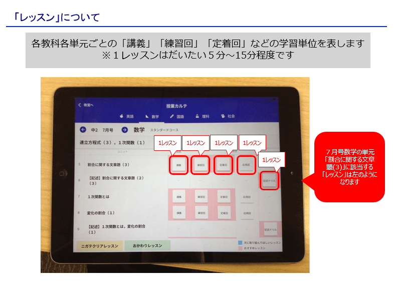 - 先生が、その学習内容の復習になる部分の教材を、翌週までの課題(宿題)として指示