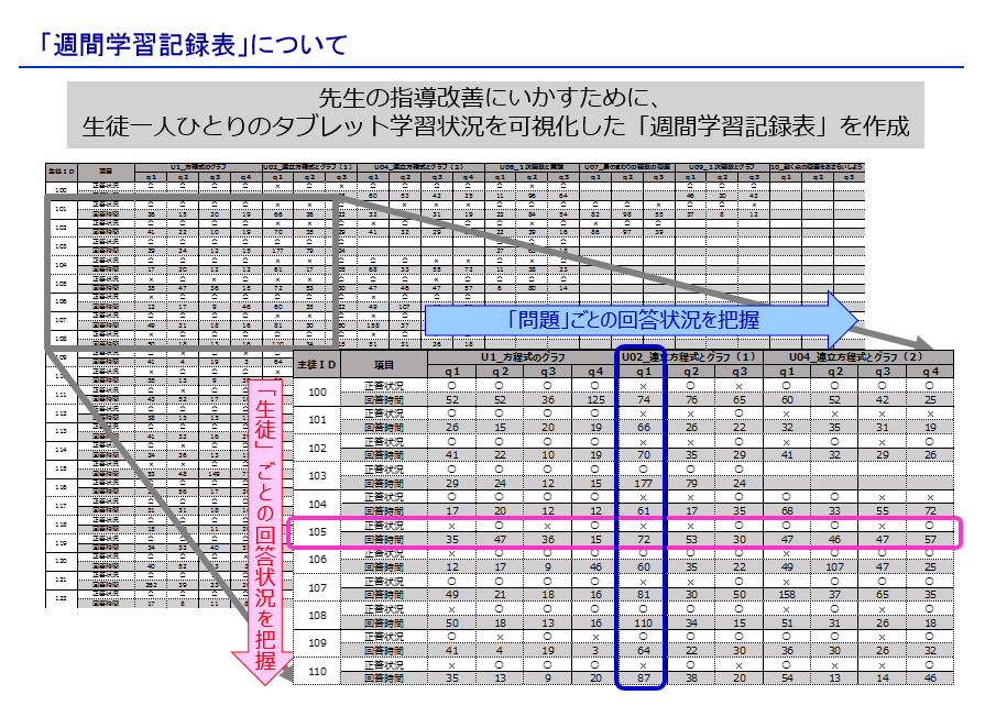 この「週間学習記録表」は、期間を区切って、取り組んだ生徒(行)ごとに、取り組んだ問題の結果(列)を一覧表にしたものです。StudentのSとProblemのPをとった「S-P表」をもとにしています。行を見ると、その生徒が、各問題に正答できたのか、全体の正答率はどれぐらいだったのかがわかります。列を見ると、その問題を、誰が正解できたのか、クラス全体でどれくらいの正答率だったかがわかります。これにより、生徒個々の課題を発見するとともに、その課題はクラス全体のことなのかを分析して、指導に活かすことができます。