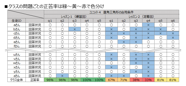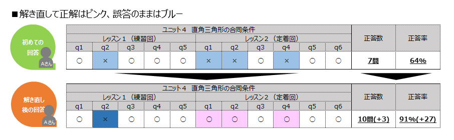まず、この表を見た先生から、「ID○番の生徒は、満点をとれるよくできる生徒と思っていたけど、この記録を見ると、ちょこちょこ間違いながら学習して、やり直しているね。努力している成果とわかってびっくりした。」と