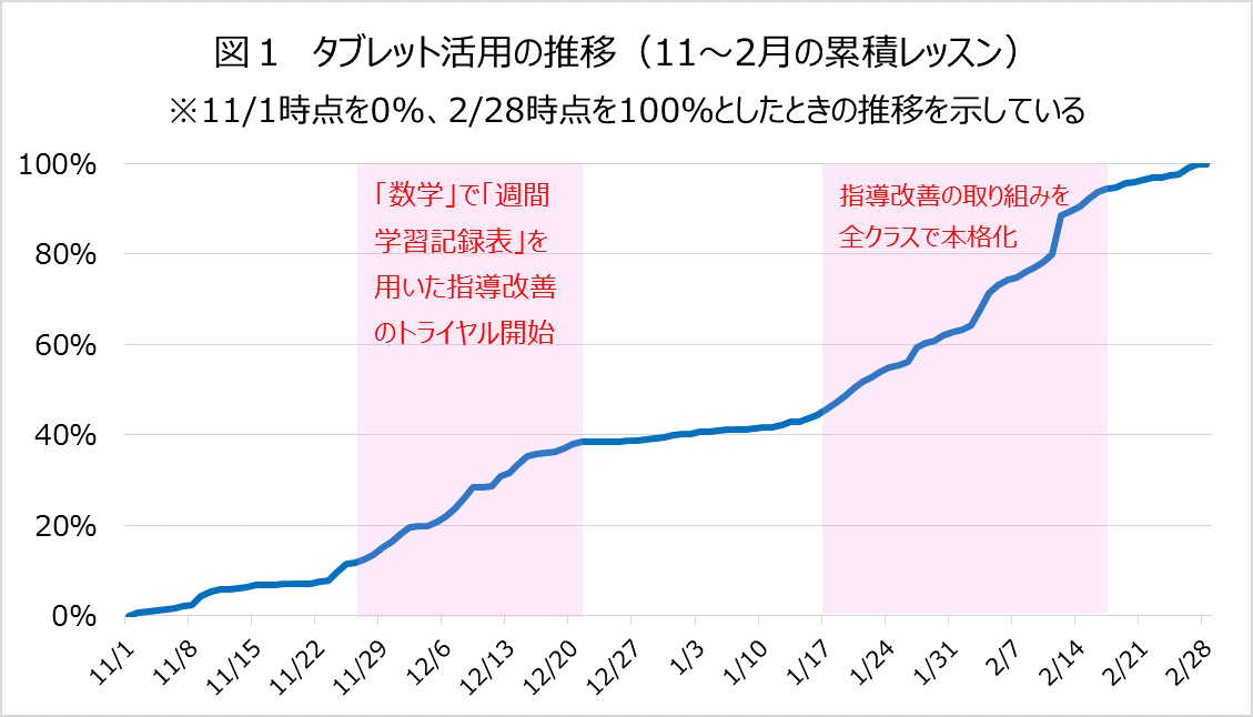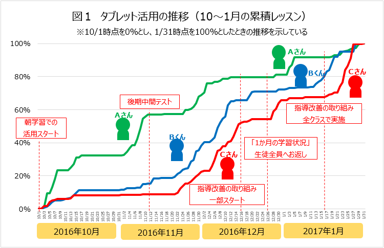 図1は、生徒一人ひとりのタブレット活用状況の推移を示しています。1月末の到達点は同じですが、どの時期に活用を伸ばしたかは異なっています。それぞれ、どんな使い方をしているのか見ていきましょう。