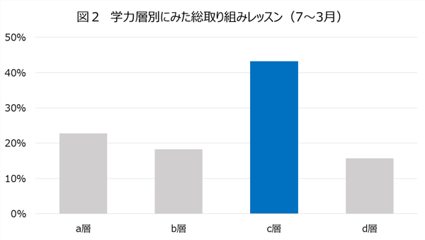 *「学力層別(a~d層)」とは、生徒へタブレットを配布する前に行った5教科の学力調査(2016年7月実施)のIRT到達度スコアを元に、上から順に25%ずつ、a~dの4つの層に分類したもの。