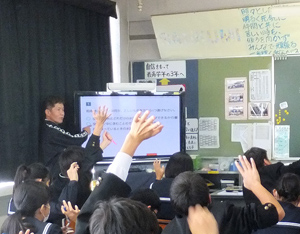 授業後、加藤先生に理科のタブレット活用方法をお尋ねすると、今回のように「タブレット教材の単元マップと授業との関係をモニターに映して使い方を指導している」とのお話。理科の活用が多い点については「教科特性として理科は覚えることが多く、学びやすいのかもしれない」とお話いただきました。授業と家庭学習を結びつける具体的な指導が、タブレット活用を促していることがうかがえました。(外部研究員・牧田和久)