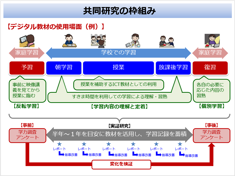 この研究は、学校や家庭でデジタル教材を用いて学習した記録を分析し、その結果を学校に提供することで、学習指導の改善に役立てることを目的としています。研究の事前・事後に、標準化された学力調査や学習アンケートを実施して、どのような成果があったのかを検証する予定です。