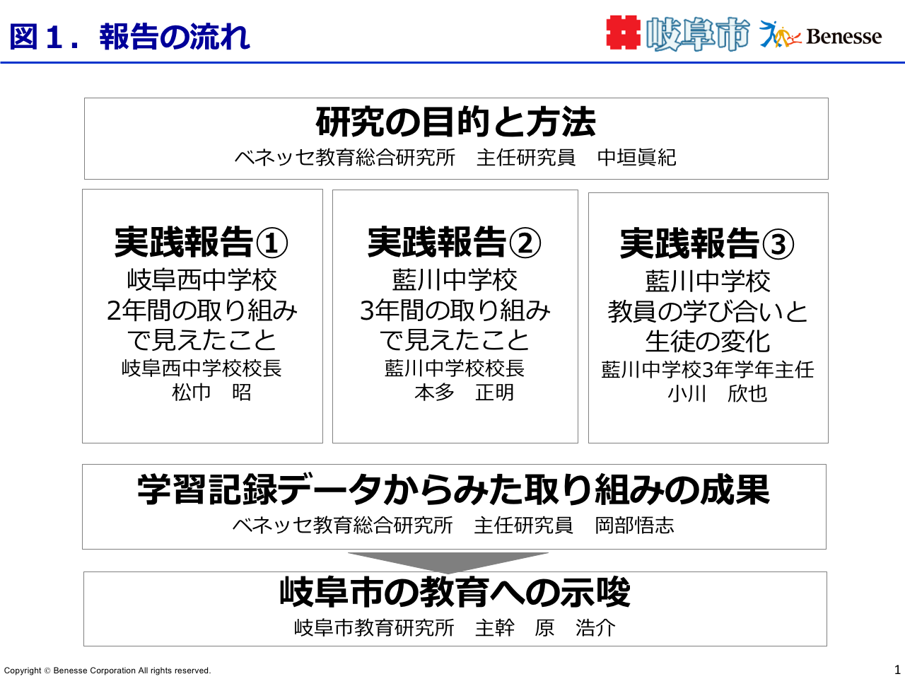 ベネッセ教育総合研究所は、岐阜市教育委員会の協力の下、2016年度から、タブレット教材を活用した共同研究プロジェクトを推進してきた。2018年度は、本共同研究プロジェクトの最終年度にあたる。2019年1月12日(土)、3年間にわたる研究成果を、岐阜市教育委員会主催の学校教育公表会で報告した。最初に、ベネッセ教育総合研究所所長・谷山和成が登壇し、エビデンスに基づいて指導と学びの質を高めることの重要性を強調。「エビデンスは、生徒の学習意欲と学力の向上にとって欠かせないものであり、先生方が自信を持って教育改革に取り組んでいくためのバックボーンにもなり得る」と述べた。報告の流れ(図1)に沿って、当日の模様を紹介する。