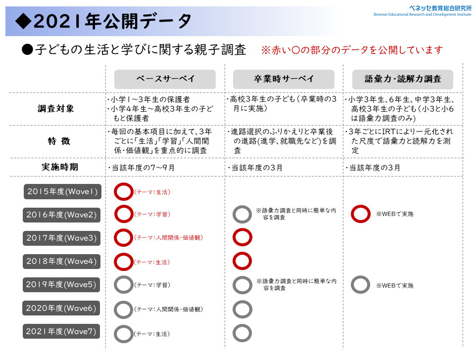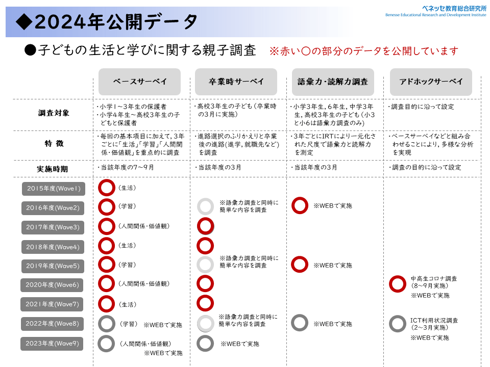 ベネッセ教育総合研究所でいままで行ってきた調査について、よりたくさんの方に使っていただくため、ローデータを公開しています。