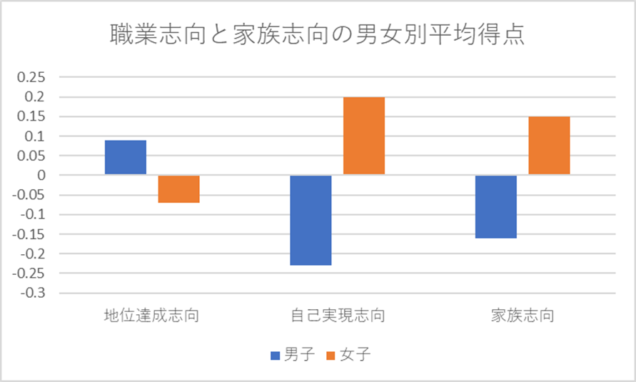 これまでの研究において、高校生は職業志向として地位達成志向(社会的地位や報酬を重視)と自己実現志向(自分の興味・関心、知識・技術を生かして物事に取り組むことを重視)を持つとされてきた(荒牧 2016; 片瀬 2005; 多喜 2018)。今回の筆者の分析においても、高校生は職業志向として地位達成志向と自己実現志向を持つことが確認できた。もう一つの「家族志向」に関する質問としては「1.自分の家族の幸せを大切に暮らしたい」の1項目のみであったため、この回答を標準化(平均値が0、分散が1となるように変換)したものを「家族志向」の得点として用いた。地位達成志向、自己実現志向、家族志向の男女別平均得点を以下に掲載する。自己実現志向と家族志向の平均値は女子の方が高く、地位達成志向は男子の方がわずかに高いことが見て取れる。