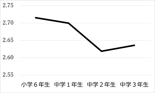注)図は4時点にわたる自尊心の平均点の推移を示している。得点は1点から4点の範囲であり、得点が高いほど自尊心が高いことを意味する。