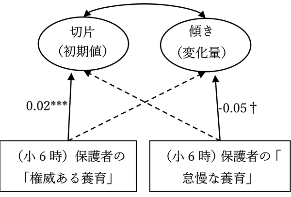 最後に、これらの養育態度が子どもの自尊心の発達変化にどのような影響を与えるのかを次の図のように再び潜在成長曲線モデルによって分析しました。その結果、小学6年生の時点で保護者の「権威ある養育」が高かった子どもほど、その時の自尊心も0.02点高くなることがわかりました。そして、小学6年生の時点で保護者の「怠慢な養育」が高かった子どもほど、自尊心が1年ごとに0.05点低下することもわかりました(ただし有意傾向)。