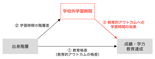 筆者の専門は教育社会学や社会階層論だが、これらの分野では学習時間をテーマにした先行研究の蓄積がある。社会学の領域では、特に図1の①「教育格差(成績格差や学力格差、教育達成の格差といった教育的アウトカムをめぐる階層間の格差)」の存在が明らかにされてきた。また、教育社会学や社会階層論を中心に、教育格差の生成メカニズムの解明に関心が集まっている。その延長線上に②「学習時間の階層差」を検討する研究が多く展開しており、学校外学習時間には偶然とはいえない階層差が実証的に確認されている(苅谷2000; Matsuoka 2017など)。とりわけ苅谷(2000)の、学習時間を「努力」指標と位置付け、一見すると階層間で平等に思える学習時間だが実は階層差が確認されるという、努力の階層差という知見は、社会学における学習時間研究の火付け役としても大きい。