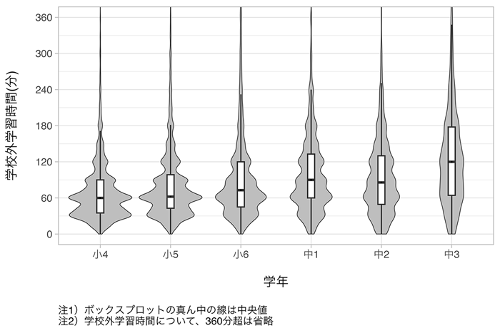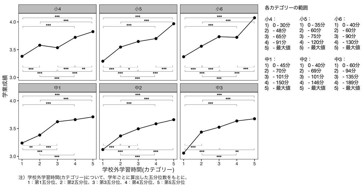 図1③のような「学校外学習時間→学業成績」について、より因果関係に迫る検討を行うには、複数の第3の要因の影響(交絡要因)を考慮するために回帰分析を用いることが一般的である。しかしここでは、まず学年ごとの学習時間の分布を確認し、それから5分位で分割した学習時間カテゴリー相互の成績平均値の比較(Bonferroni法による多重比較)によって確認することで、視覚イメージとともに2変数の関連について考えていくことにする。