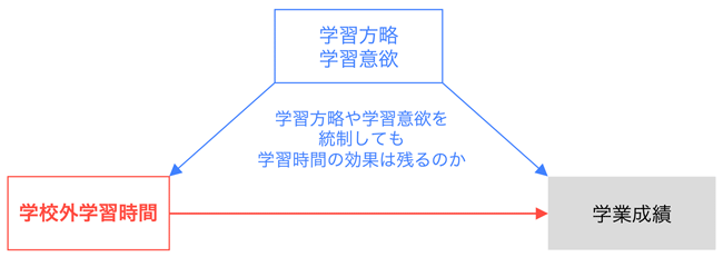 学習方略と学習意欲のいずれも成績と強い関連を持つ変数であるため、オーバーコントロールの可能性も否定できない。さらに、学習時間に意味がないというような短絡的な結論も適切ではない。ただ、少なくとも学習方略や学習意欲の伴わない学習時間について、成績にポジティブな効果をもたらすとは言えないだろう。つまり、勉強の仕方がつかめず、学習する内容について全く興味を示ない状態である場合、どんなに大人がお膳立てして学習時間(あるいは学習環境)を確保しても、少なくとも成績にはあまり影響しない可能性がある。常識的な結論にすぎないが、とにかく机の前に座らせられて勉強させられる、という強制労働的な学習時間には、あまり積極的な意味を見出すことはできなさそうだ。