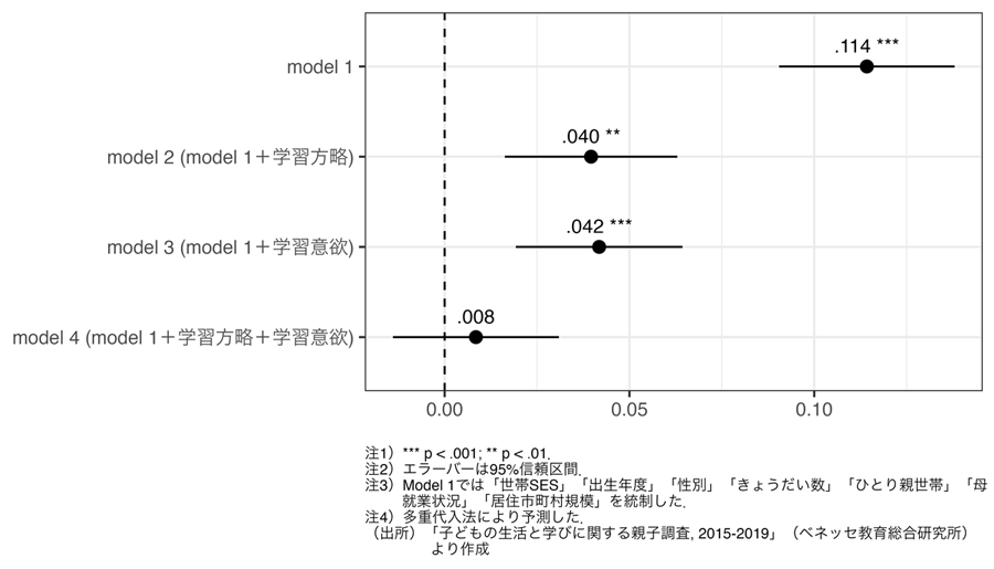 学習時間の回帰係数のみプロットした図5を参照すると、model 1では0.114だが、学習方略や学習意欲をそれぞれ投入したmodel 2やmodel 3では大幅に回帰係数が減少している。つまり、学習時間の効果のかなりの部分が学習方略や学習意欲の効果に吸収されると考えられる。さらに、学習方略と学習意欲の両方を統制したmodel 4では、学習時間の回帰係数はほぼ0に近く、かつ統計的に有意でない。