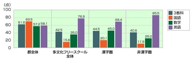 専門性の高い理科や社会の勉強まで手が回らないため、ほとんどの子どもたちが3教科入試を選ぶが、3教科とて簡単ではない。次のデータを見れば、特に非漢字圏の子どもたちにとっては日本語での受験がどのくらい難しいことなのかが垣間見える。