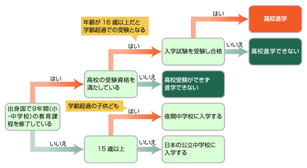 例えば、16歳の子どもが日本で公立高校に進学したいと希望した場合、どのようなことが起こるのだろうか。まず、その子が出身国でどのような教育課程を修了したのかが問われる。出身国で9年間の教育課程を修了していた場合、つまり日本の中学校にあたる学校を卒業していた場合、受験資格を満たし受験に合格すれば日本の高校に進学できるが、受験の難しさは先に説明したとおりだ。