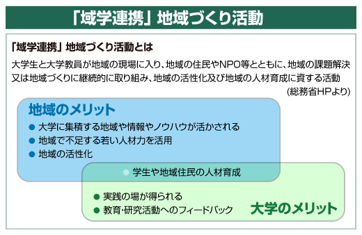 地域やNPO・NGOの活動には若い活動家の参画が不可欠だが、人材不足で悩む団体は多い。そのため、学生が集まる場である大学と活動を通して連携できるメリットは大きい。大学側も、実践的な教育の場を持つことができる。