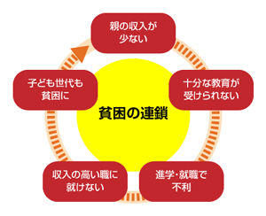 学歴社会において教育費の私費負担が多いことは、貧困の連鎖を生む強力な要因となる。私費でまかなう教育支出のうち大きいのは、習い事や塾。東京都には「受験生チャレンジ支援貸付事業 」のように塾費用の支援制度があるが、すべての自治体に同様の制度があるわけではなく、「お金がなければ塾には行けない」のが一般的だ。その結果、塾に行っている子と塾に行けない子との間に学力の差がついてしまい、その差が進学や将来の就職にも影響を与える。
