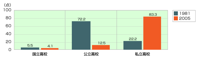 渡辺さんによると貧困が一因となって引き起こされる「教育格差」は確実に広がっているといい、こんな例を紹介してくれた。「ここに国公立大学7校の医学部に合格した学生の出身高校データ があります。1981年には、該当する医学部に合格した高校生は公立高校出身者が多かったんです。しかし2005年になると公立高校出身者は減り、私立高校出身者が大幅に伸びています。
