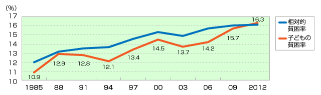 「2012年の数字は、前回の2009年度調査結果に比べてそこまで悪くなっていないだろうと関係者は予想していました。しかし、子どもの貧困率は過去最悪で16%を超えてしまった。さらに相対的貧困率が0.1ポイントの悪化にとどまったのに対し、子どもの貧困率は0.6ポイント悪化しています。国全体の貧困率よりも、子どもの貧困率の方が、急速に悪化をしているんです。」
