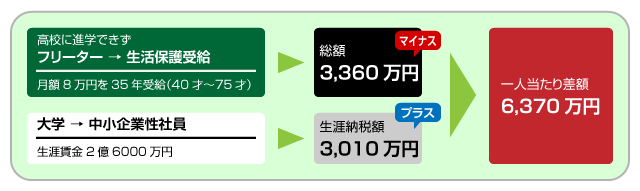 たとえば、高校に進学できず、中学を卒業してすぐにフリーターになった子がいるとする。その後も不安定な就業を続け、40歳からは月額8万円の生活保護を受け始め、そのまま75歳になったとすると、その子が35年間で受給する生活保護の総額は3,360万円。一方、同じ子が教育支援を受けて高校に進学することができ、その後大学も卒業して中小企業の正社員になれた場合、その子の生涯賃金は2億6,000万円、生涯で収める税金は3,010万円に上る。その差額は6,370万円だ。