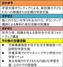 以来、キッズドアでは大学生や社会人ボランティアが、低所得やひとり親、生活保護、児童養護施設、母子生活支援施設の子どもたちを対象に、無料の学習会やキャリア教育、体験活動を行っている。2011年に起こった東日本大震災以降は、仙台に拠点を構え被災家庭の子どもたちにも同様の支援を行っている。