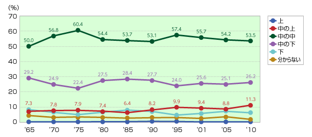 1956年の経済白書に「もはや戦後ではない」と記述され、その後日本経済は驚くべきスピードで発展を遂げてきた。1970年代に入ると、「国民生活に関する世論調査」で自分の生活を「中の中」と回答する人が最も多く、かつこの頃日本の人口が1億人を突破したこともあって「一億総中流」ともいわれる時代になった。