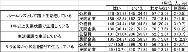 この調査によると、生活保護を受給して生活している人のことを「貧困にある」と考えている人は公務員で約3割、民間企業に勤める人だと3割を切っている。「ホームレスで路上生活をしている人は貧困だと答えた人が公務員で約5割、民間企業に勤める人では5割を切っています。住む家がなく、路上で生活せざるを得ない人が貧困でないとしたら、貧困とはどのような状態を指すのでしょうか…。多くの人がこうした『貧困観』を持っている現実を認識し、なぜこのような結果になってしまうのかということを常に考えながら、貧困対策を考えていかなければいけません。」