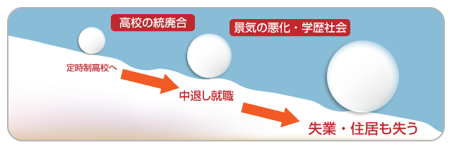 「不利の雪だるま」の図で示すのは、A君に限らず、高校中退から不利の拡大が起こってしまった場合の事例だ。高校中退者のなかには、その後仕事を続けたり転職したりする際に学歴による差別や不利益を経験する人もいる。景気悪化の影響で仕事が見つからなかったり、リストラの対象になってしまえば、不利の雪だるまはどんどん大きくなっていく。悪化の一途をたどっていったケースの場合、失業や住む家がない、心や体を病んでしまい仕事ができない等、そこから抜け出すのが非常に難しい、深刻な貧困状態に陥ってしまう。