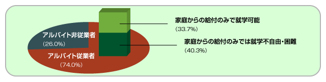 日本学生支援機構の行っている「学生生活調査」によると、大学学部の昼間部に通う学生のうち、アルバイト従事者は74.0%。このうち40.3%の学生が「家庭からの給付のみでは就学不自由・困難」と答えており、学生のうちの約4割が就学費用を多少なりとも自身のアルバイトで賄っていることがわかる。