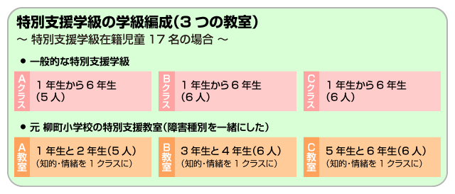 一般的な特別支援学級は、1年生~6年生までを全学年一緒にして人数で学級編成をする。当時の柳町小学校においても、それまでの情緒障害と知的障害という学級の分け方にはせず、A教室は低学年、B教室は中学年、C教室は高学年の教室と、学齢で3つの教室に分けた。より個別ニーズに対応することを目的として、子どもたちは所属級をベースに、個別支援計画に基づいて個別授業の時間は特別支援の教室に移動するようにした。