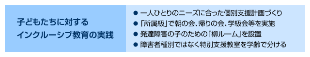 地域の公立小中学校には、通常学級のほか「特別支援学級」があるが、この学級に障害のある子どもたちが通うことを意味するのではなく、一人ひとりのニーズに合った教育支援を通常学級のなかで行うことがインクルーシブ教育なのだという。