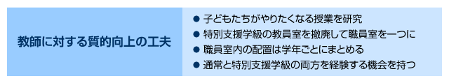 職員室を同室にし、教師の机を学年ごとにまとめた。このことにより、通常学級と特別支援学級の担任同士ですぐに日常の細かい連絡事項や申し送り、情報の交換、意思伝達ができるようになった。