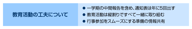 中間報告としての評価を1学期の期末までに1回、2学期の期末までに1回を加え、年間で計5回の通知表を出した。学校が真剣に取り組んでいる姿勢を保護者に対して示し、理解してもらうことが目的。わずか1学期間で子どもたちが成長していく姿を可視化した。教師間の情報共有にもなり、また子どもや保護者の励みにもなった。