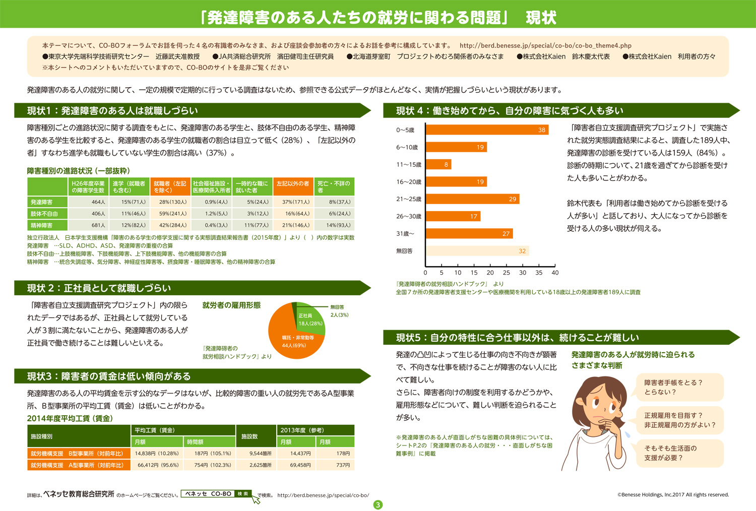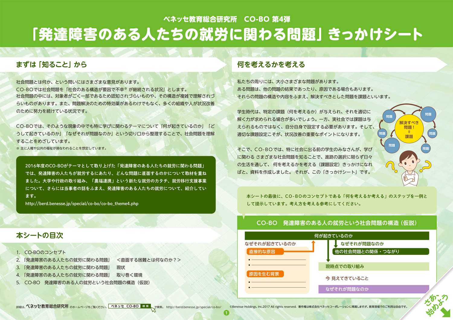 また、インタビューで私が述べた雇用の問題点の指摘も、社会構造の準備性の不足から、一部の人々の参加が難しくなることについて触れたつもりでした。こうした点をふまえて、一連のCO-BO記事や「きっかけシート」を読んでみてください。