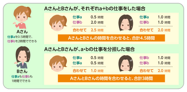 Bさんが1時間でできる仕事量〔a+b〕について、Aさんはaの仕事は0.5時間でできるけれどもbの仕事は2時間かかるとします(下図参照)。AさんBさんがそれぞれa+bの仕事をすると0.5(時間)+2(時間)+1(時間)+1(時間)=4.5時間かかりますが、Aさんが2人分のaの仕事を、Bさんが2人分のbの仕事をすると0.5(時間)×2(人分)+1(時間)×2(人分)=3時間でできてしまいます。お互いがお互いを理解して、歩み寄ることができれば、社会による障害は減らしていけるのではないでしょうか?