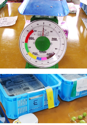ラベルを付けたはかり(写真上)と、等級を書いた箱(写真下)