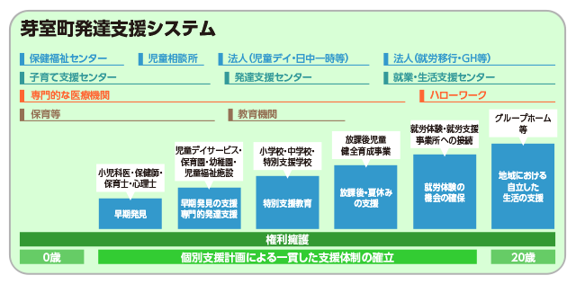 障害のあるなしにかかわらず、すべての子どもたちの権利を守るための仕組みを作っていく。こうした考えの下、「安心して生み育てることのできる子育て支援」「充実した幼児教育」の取り組みのひとつとして、「芽室町発達支援システム」が整備されている。